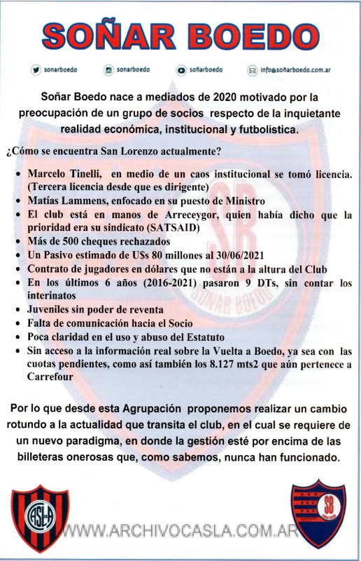 - Folleto entregado en la presentación oficial de la agrupación Soñar Boedo realizada en el bar Esquina Homero Manzi el 01 de abril de 2022