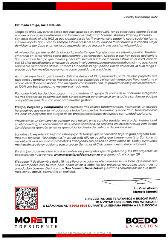 Carta del candidato a presidente Marcelo Moretti