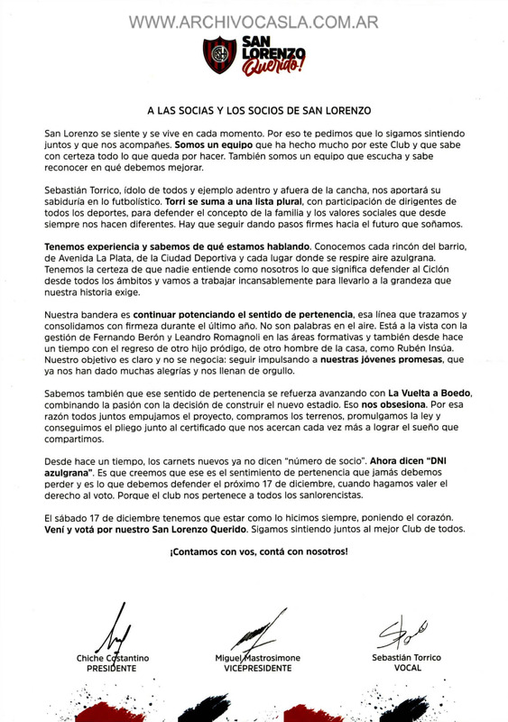 Carta a los socios por parte de los candidatos Costantino (presidente) Mastrosimone (vicepresidente) y Torrico (vocal)