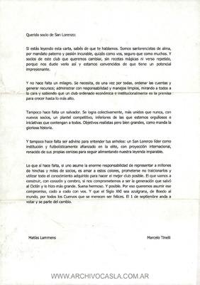 [Carta al socio de San Lorenzo] Carta enviada al socio, y firmada por Matías Lammens y Marcelo Tinelli, en referencia a las elecciones extraordinarias del 2012 -