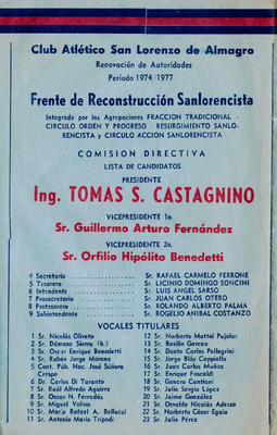 Boleta electoral 1974 - Frente de Reconstrucción Sanlorencista Boleta electoral de la agrupación Frente de Reconstrucción Sanlorencista. Compuesto por: Fracción tradicional, Círculo orden y progreso, Resurgimiento sanlorencista y Círculo acción sanlorencista