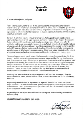 Agrupación Siglo XXI Carta enviada al socio junto con una boleta electoral de la agrupación San Lorenzo Siglo XXI -