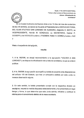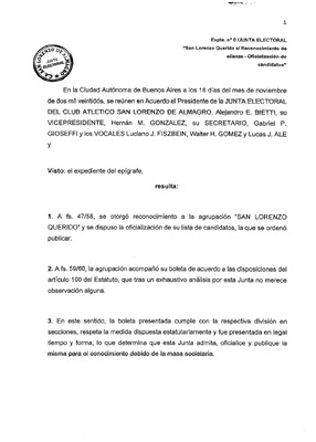 Expte n°0/JUNTA ELECTORAL : "San Lorenzo Querido s/ Reconocimiento de alianza - Oficialización de candidatos Aprobación de la boleta electoral presentada por la agrupación San Lorenzo Querido así como también la asignación de número de lista. -