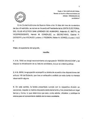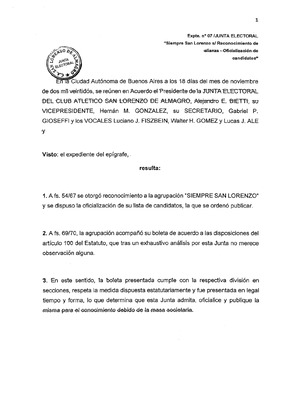 Acta nro. 01/2023 junta electoral del Club Atlético San Lorenzo de Almagro para el período 2023-2027 Acta de constitución de la Junta Electoral del Club Atlético San Lorenzo de Almagro para el período 2023-2027. Resolución N°1/2023 mediante la cual se realiza el llamado a elecciones ordinarias. -
