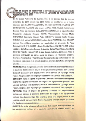 Acta de cierre de escrutinio y distribución de cargos junta electoral del Club Atlético San Lorenzo de Almagro para el período 2019-2023 -