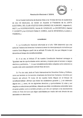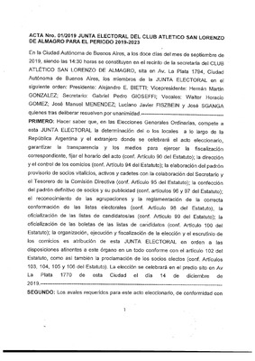 Acta Nro. 01/2019 junta electoral del Club Atlético San Lorenzo de Almagro para el período 2019-2023 Primer acta electoral desarrollada por la Junta Electoral bajo la cual comunica las atribuciones del órgano en cuestión. -