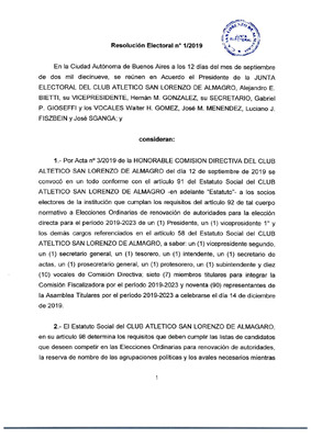 Resolución electoral N° 1/2019 Resolución de la Junta Electoral del club mediante la cual se realiza el llamado a elecciones ordinarias. -