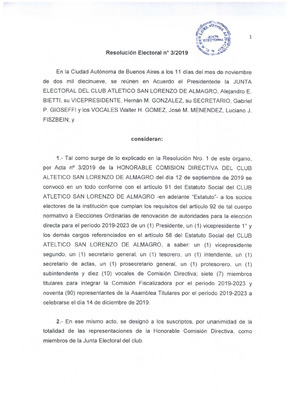 Resolución electoral N° 3/2019 Documento en el cual la junta electoral resuelve que las elecciones se desarrollarían en avenida La Plata. -