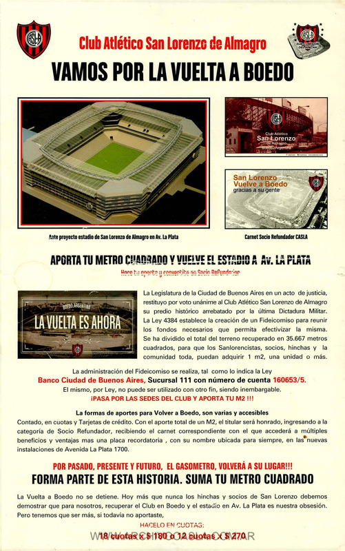 Folleto referente a la implementación del Fideicomiso CASLA para la vuelta a Boedo, firmado por la Subcomisión del Hincha.
