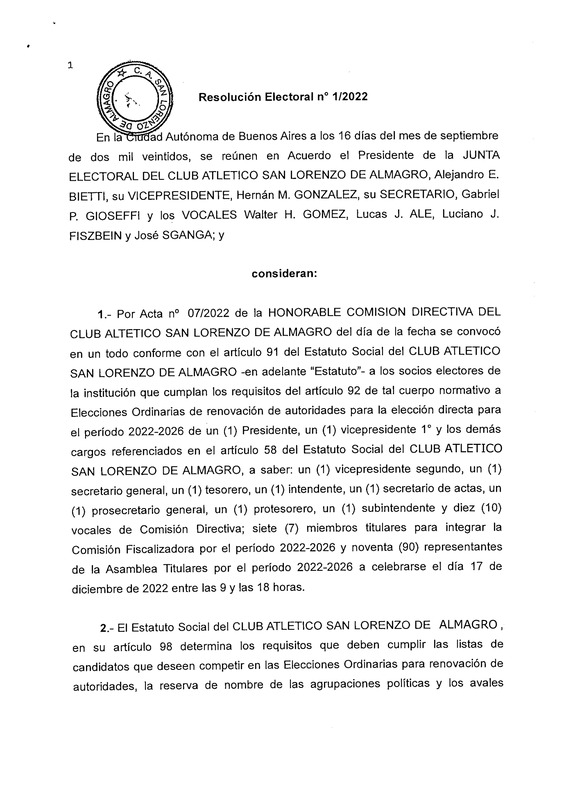 Resolución de la Junta Electoral del Club Atlético San Lorenzo de Almagro en donde se establece fecha y lugar para las elecciones.