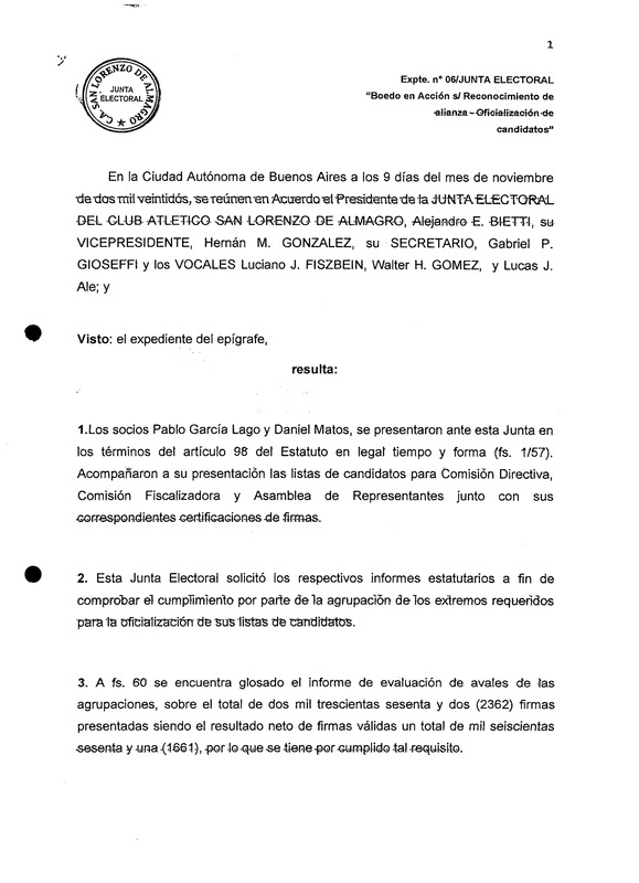 Expte. n° 06/JUNTA ELECTORAL : "Boedo en Acción s/ Reconocimiento de alianza - Oficialización de candidatos"