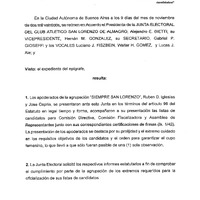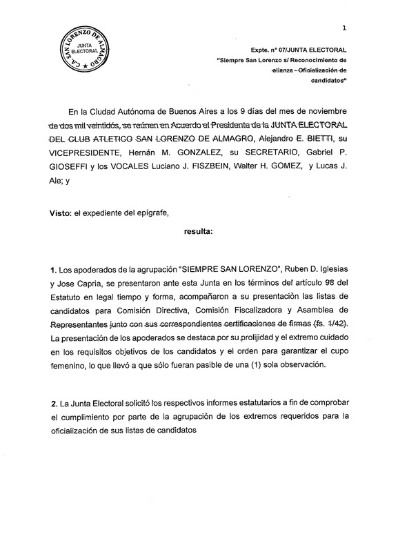 Expte. n° 07/JUNTA ELECTORAL : "Siempre San Lorenzo s/ Reconocimiento de alianza - Oficialización de candidatos"