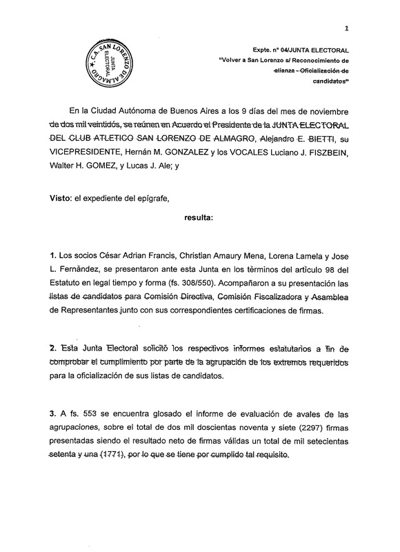 Expte. n° 04/JUNTA ELECTORAL : "Volver a San Lorenzo s/ Reconocimiento de alianza - Oficialización de candidatos"