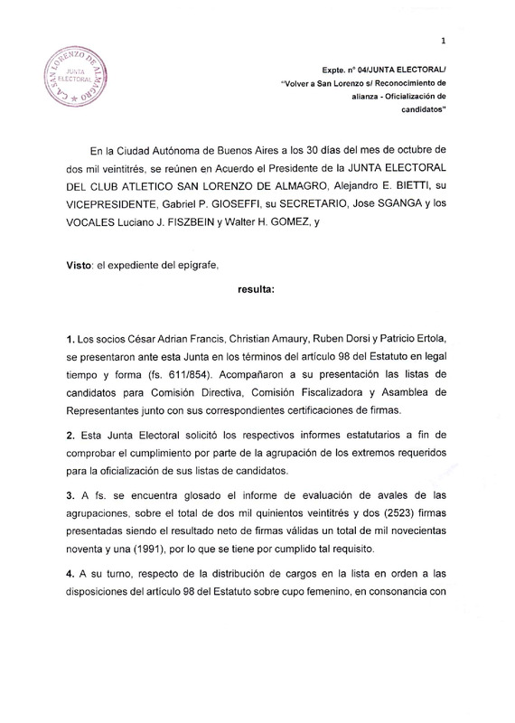 Expte. n° 04/JUNTA ELECTORAL : "Volver a San Lorenzo s/ Reconocimiento de alianza - Oficialización de candidatos"