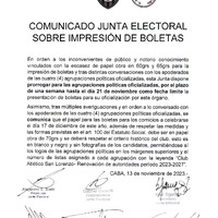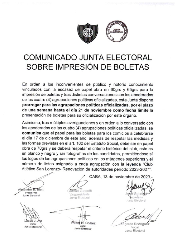 Comunicado realizado por la Junta electoral del club, en relación al establecimiento de una prórroga para presentación de las boletas electorales debido a conflicto de escasez del papel reglamentario.