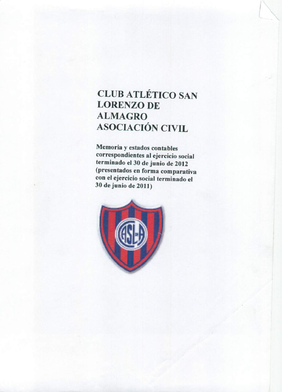 Club Atlético San Lorenzo de Almagro : Memorias y estados contables correspondientes al ejercicio social terminado el 30 de junio de 2012 (presentados en forma comparativa con el ejercicio social terminado el 30 de junio del 2011)