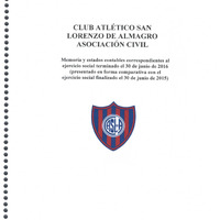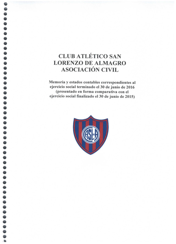 Club Atlético San Lorenzo de Almagro : Memorias y estados contables correspondientes al ejercicio social terminado el 30 de junio de 2016 (presentados en forma comparativa con el ejercicio social terminado el 30 de junio del 2015)