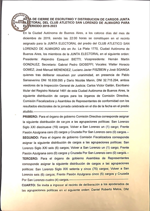 Acta de cierre de escrutinio y distribución de cargos junta electoral del Club Atlético San Lorenzo de Almagro para el período 2019-2023