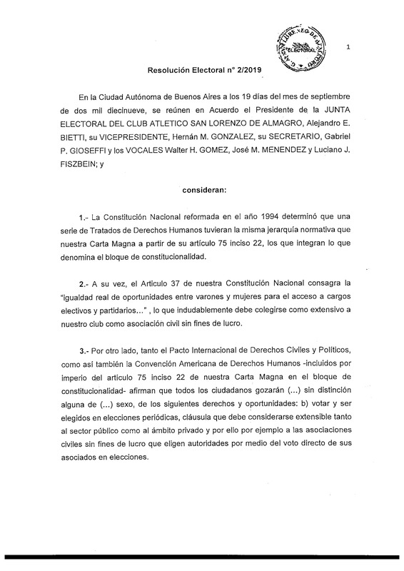 Resolución de la junta electoral referente al cupo femenino en las elecciones del 2019