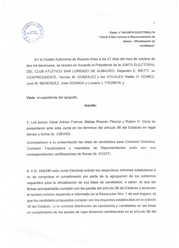Expediente originado por la Junta Electoral del Club Atlético San Lorenzo de Almagro donde comunica la oficialización de candidatos de la lista Volver a San Lorenzo para el proceso eleccionario del 2019.