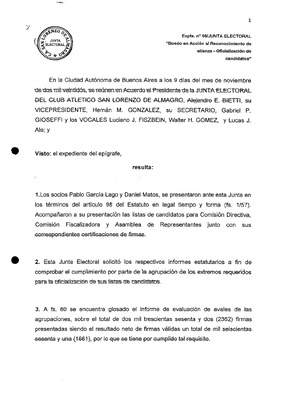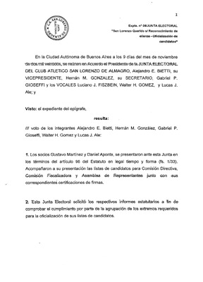 Expte. n° 08/JUNTA ELECTORAL : "San Lorenzo Querido s/ reconocimiento de alianza - Oficialización de candidatos" Oficialización de lista de candidatos de la agrupación San Lorenzo Querido -
