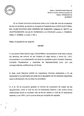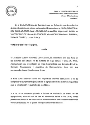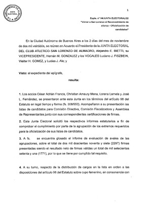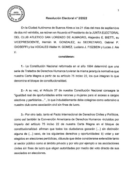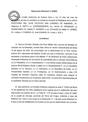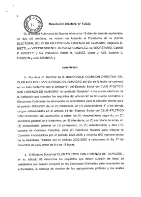 Resolución electoral n°1/2022 Resolución de la Junta Electoral del Club Atlético San Lorenzo de Almagro en donde se establece fecha y lugar para las elecciones. -