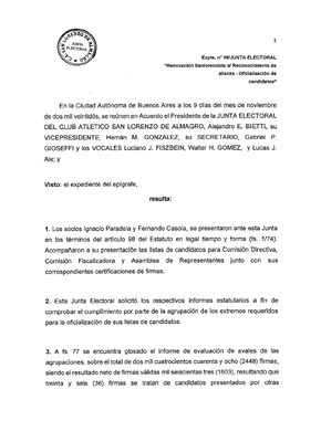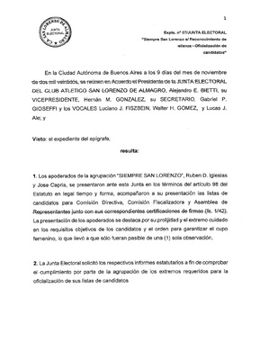 Expte. n° 07/JUNTA ELECTORAL : "Siempre San Lorenzo s/ Reconocimiento de alianza - Oficialización de candidatos" Oficialización de lista de candidatos de la agrupación Siempre San Lorenzo -