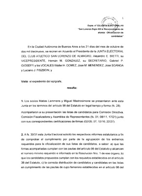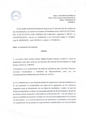 Expte. N° 4/JUNTA ELECTORAL/19 Expediente originado por la Junta Electoral del Club Atlético San Lorenzo de Almagro donde comunica la oficialización de candidatos de la lista Volver a San Lorenzo para el proceso eleccionario del 2019. -