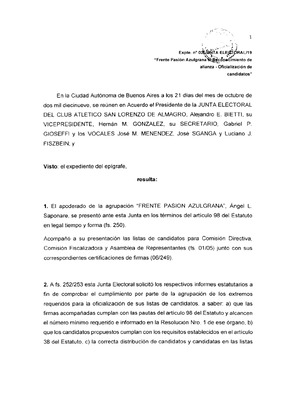 Expte. N° 2/JUNTA ELECTORAL/19 Expediente originado por la Junta Electoral del Club Atlético San Lorenzo de Almagro donde comunica la oficialización de candidatos de la lista Frente Pasión Azulgrana para el proceso eleccionario del 2019.